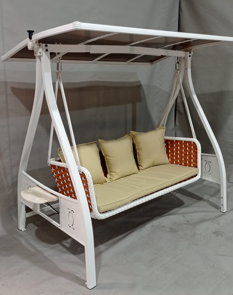 נדנדת ישיבה 3 מקומות קלאסית ונוחה בשילוב פאנל סולרי שנטען מהשמש ומנורת לד , בעלת 3 מקומות ישיבה נוחים ומרופדים, עשויה מאלומיניום , בעלת גגון העשוי מפוליאסטר הניתן לכיבוס, מבנה הנדנדה בצבע לבן ומגיעה עם מדפי צד לכוסות