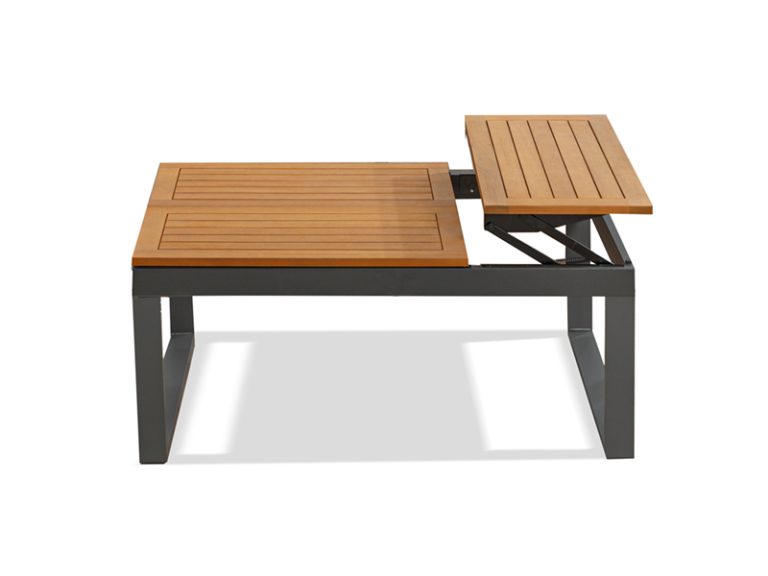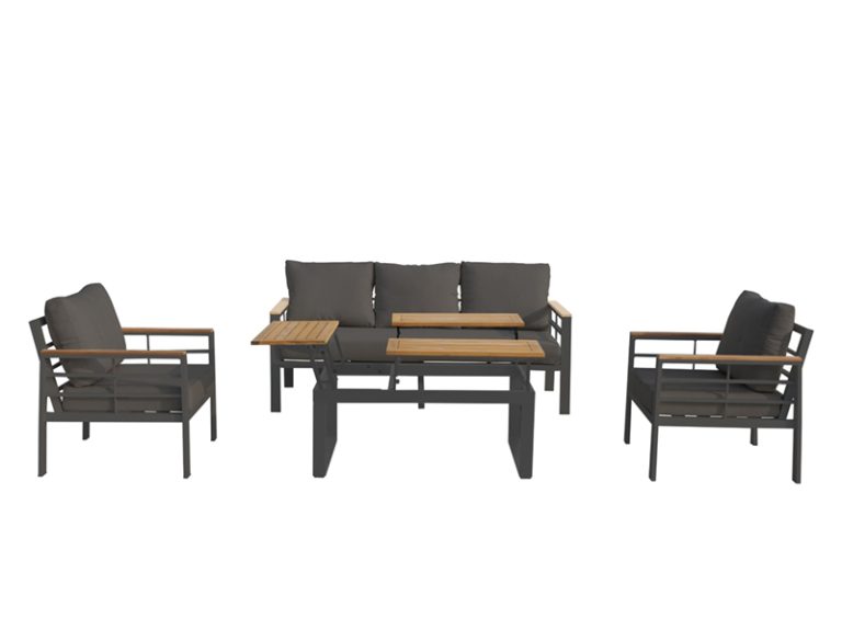 מערכת ישיבה בעלת חמישה מושבים איכותית בעיצוב עכשווי, שתשדרג כל גינה ומרפסת. שולחן המערכת נפתח בצורה מיוחדת “פרפר” המגביה את השולחן למעין מגש אוכל.