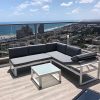מערכת הישיבה זמינה עם מסגרת אלומיניום בצבע לבן בשילוב ריפוד וכריות בצבע אפור או עם מסגרת אלומיניום בצבע אפור כהה בשילוב כריות בצבע אפור