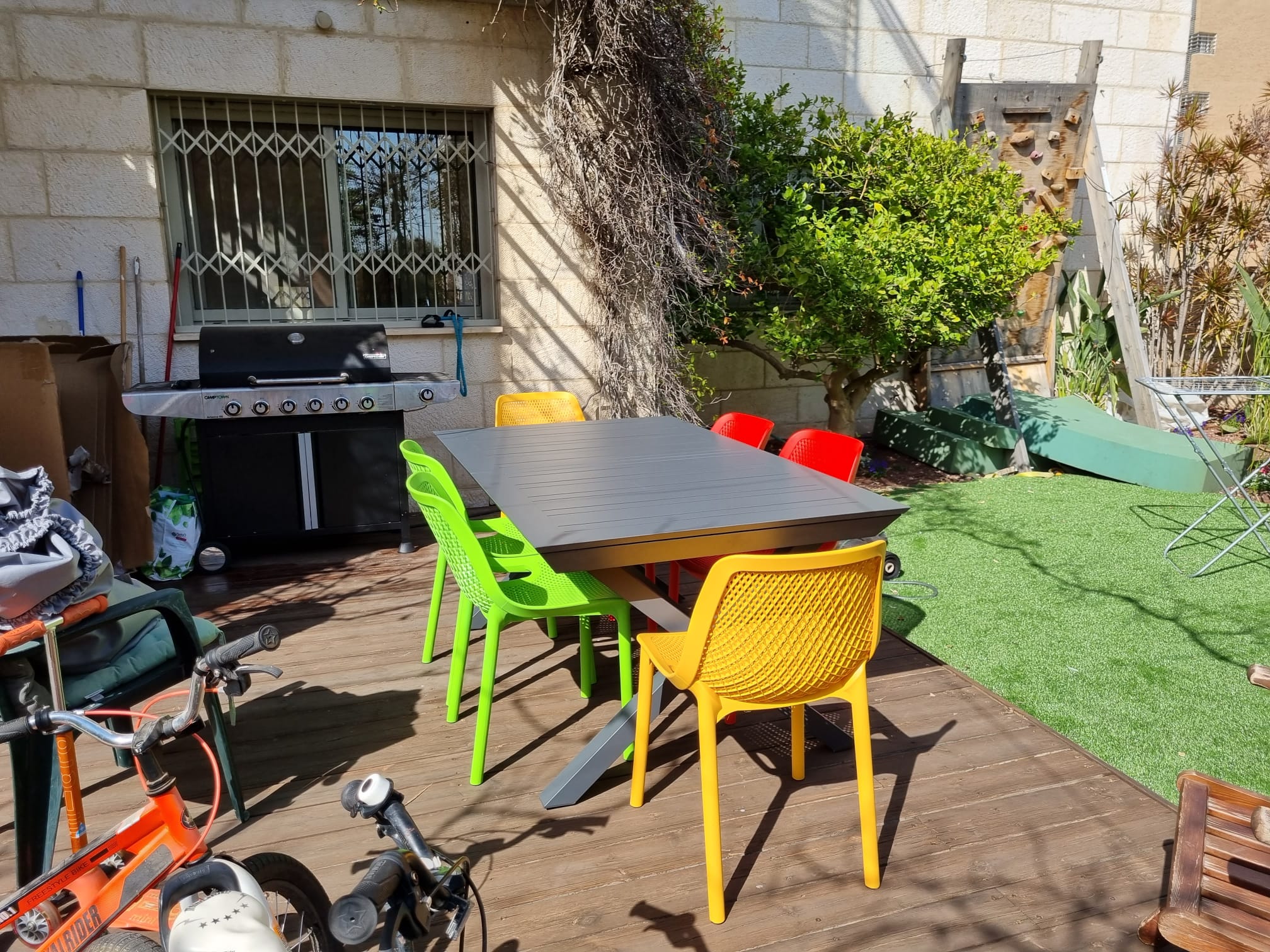 0319 שולחן מאלומיניום רגל X נפתח מ172-243 כולל 6 כיסאות צבעוניים